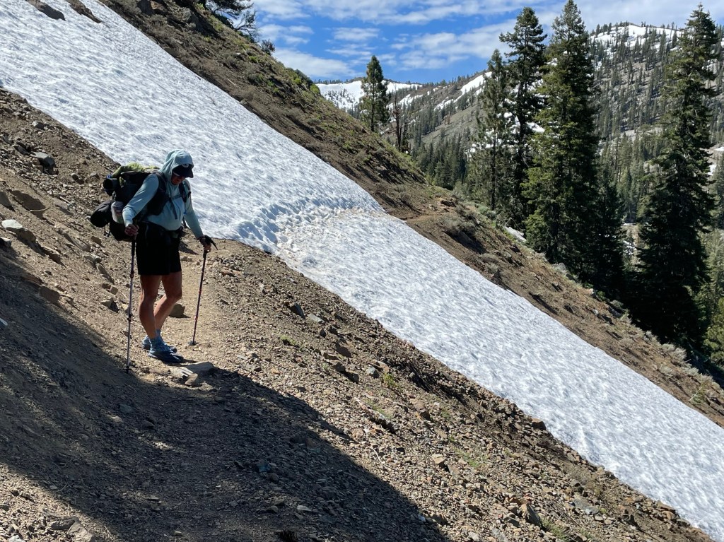 As we were hiking, it seemed the snow would be fine from the trail. We put away our crampons and Ellen removed the whippet pick from her trekking pole. That was a mistake. We soon got to a patch of snow of about 20 yards wide and with steep exposure. The snow was now mush. As Ellen made her way across, she slipped and fell on her side. She didn’t slide away but was stuck in a very precarious position.