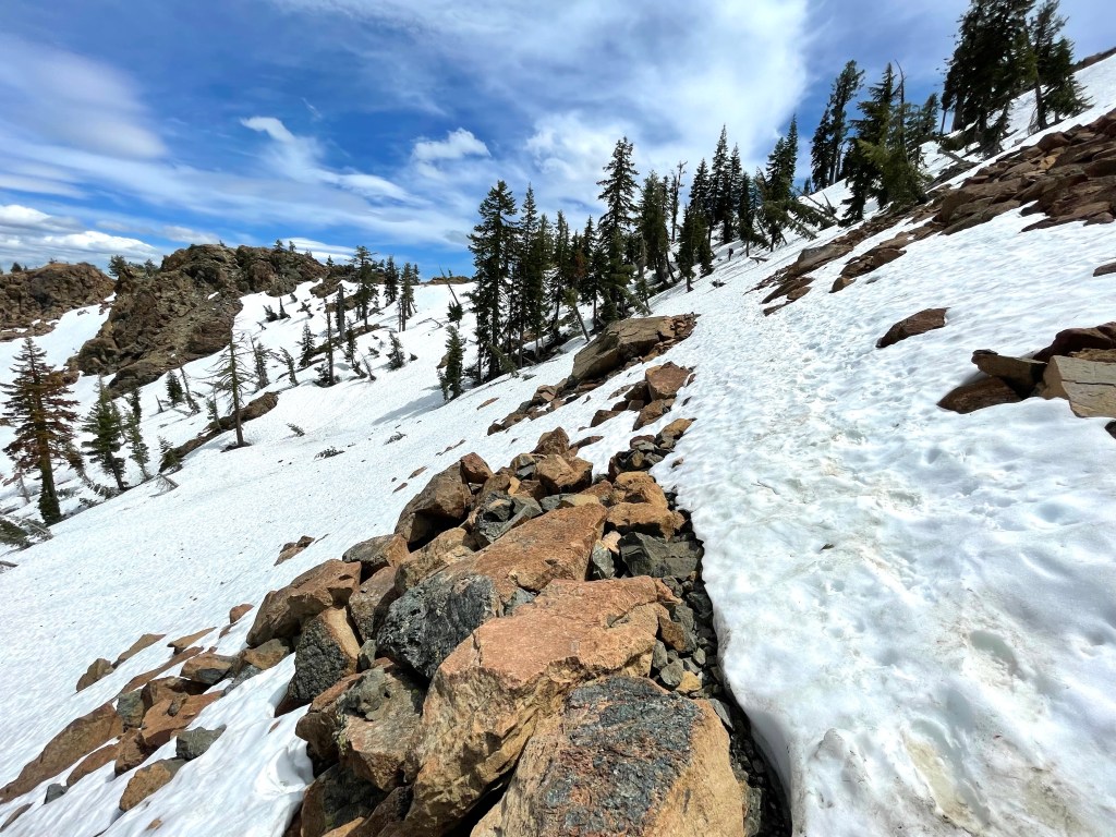 We had about 1.1 miles until the trail junction to Boulder Lake. The trail had started to get more snow covered and then we saw what was ahead. Once at the junction we put on our crampons and whippet. We studied the maps, both paper and in the FarOut app to judge steepness of the terrain.