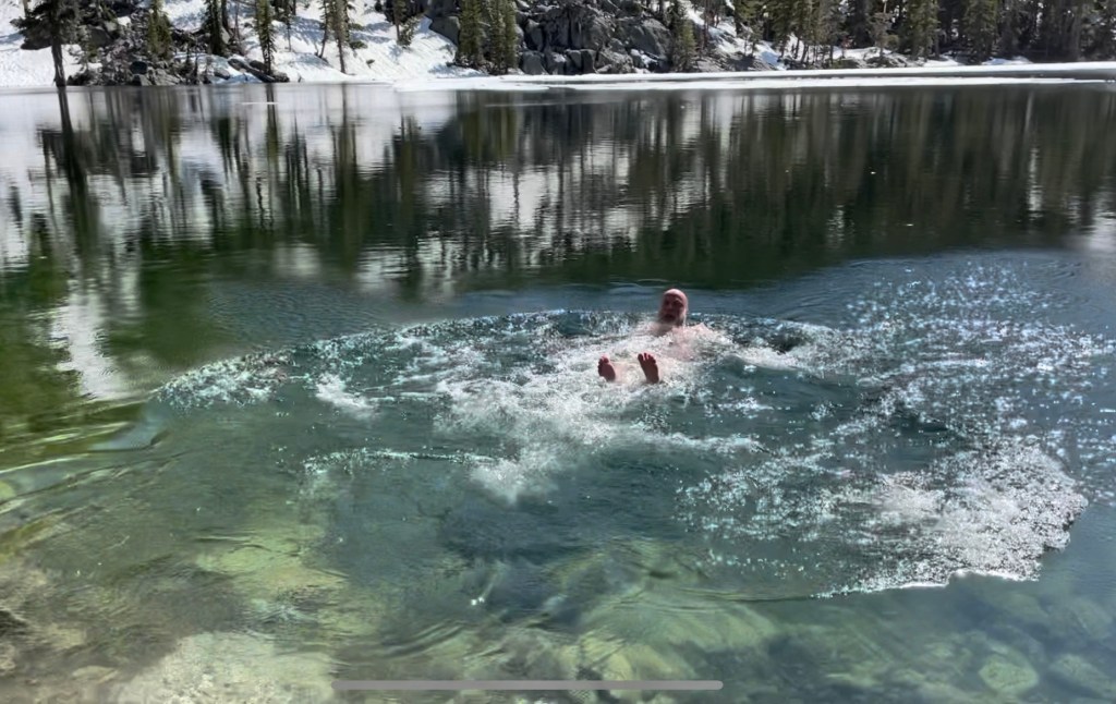 At 3 pm we made the short uphill climb, 0.2 miles off trail to Porcupine Lake, a beautiful lake half surrounded by snow covered mountains. The lake was still partially covered in ice.
