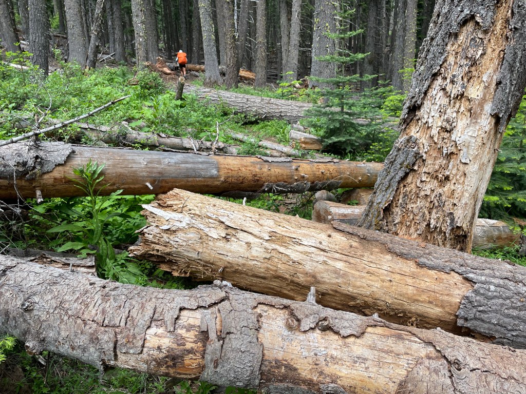 For the entire morning we only had a couple of views of Mt. McLoughlin but the remaining time was looking at trees, climbing over downed trees, and fighting mosquitos. We were both getting bored with this section of trail. This is what PCT hikers call the “Oregon blues”.