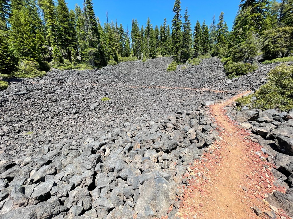 Wrong! As soon as we rounded the corner from our lunch spot and last water source for the day, the lava fields started. The trail designers created a trail right across the fields and used smaller rocks for the path. The bad thing was that the we felt most of the rocks right through our shoes. The good thing was that we had new views of Mt McLaughlin.