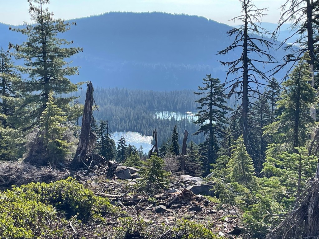 We finally got going after that excitement. After a half hour the terrain totally changed. We were now on a ridge in burn area from a 2014 fire. There was a breeze and the mosquitos were gone! Plus we got some views of 4 mile lake, Mt. McLoughlin, and surrounding mountains. This made a positive change in our attitudes.