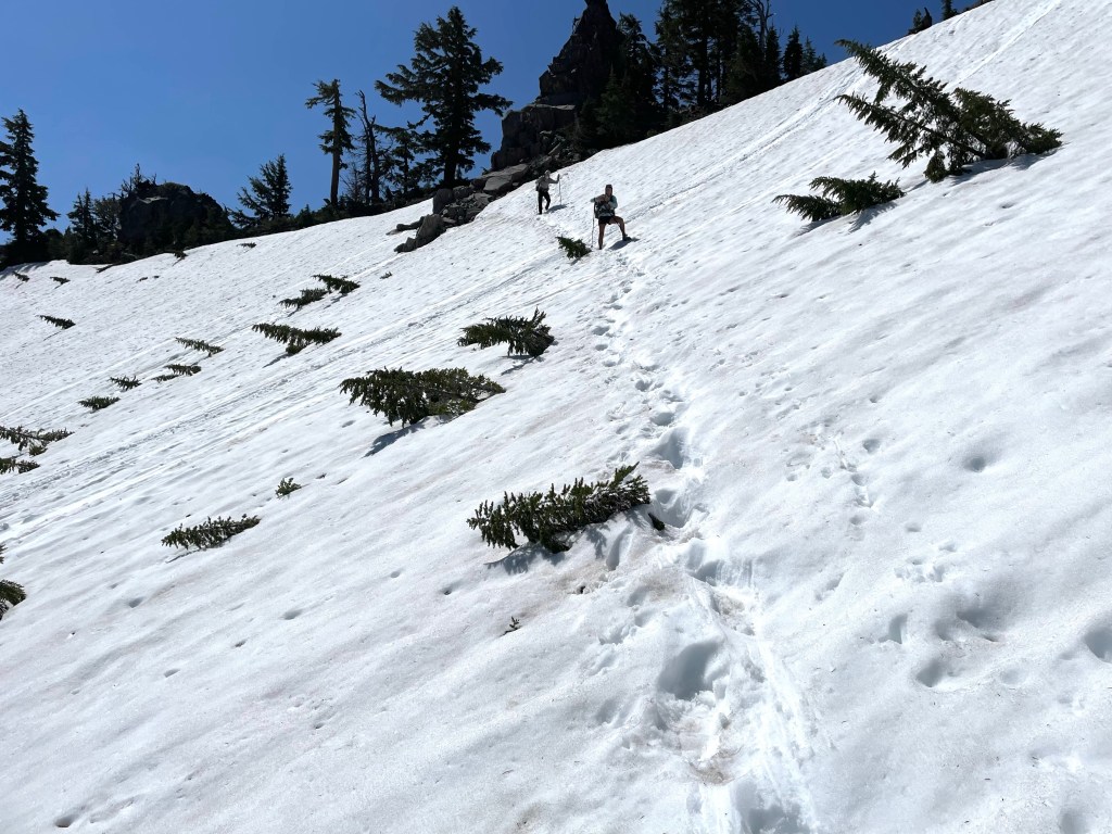 We had about a 4 mile ridge walk until we reached a saddle next to Devil’s Peak and a steep area rumored to be holding significant snow. Once at the saddle we indeed saw lots of snow. However, we also saw that people glissaded down from the top. The consequences were not high and the traverse looked fairly straight forward.