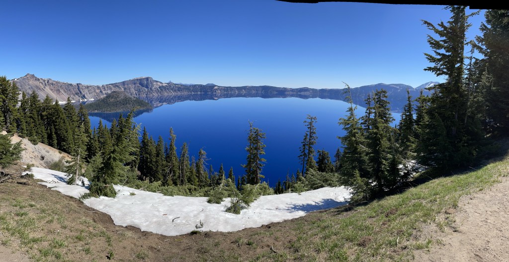 We walked up to the rim of Crater Lake and it felt just like walking up to the rim of the Grand Canyon for the first time. Crater Lake blew our minds away. It was gorgeous. The water is sooo blue. We would walk 10 feet and take a picture, walk 10 more feet and taken another picture. We’d walk a little bit along the rim and the view would change. The lake was like glass and all the surrounding mountains were reflected into the lake. It was beautiful.