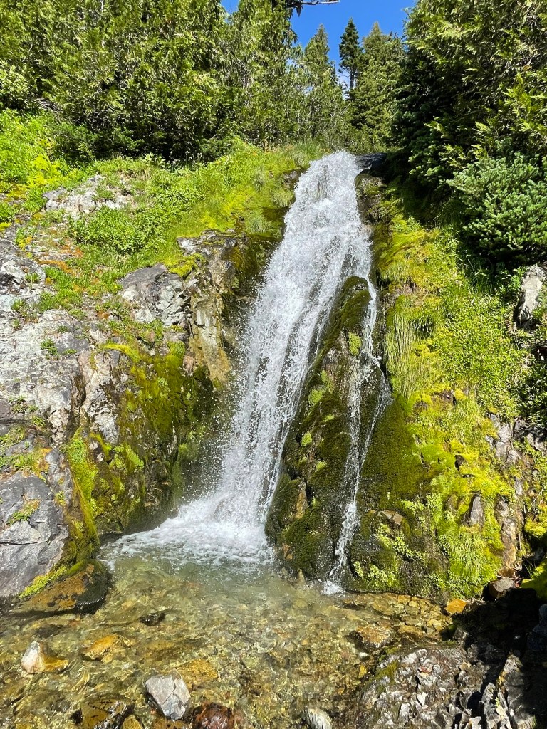 After our break we went over Cispus Pass and saw a beautiful green valley below some jagged peaks. The trail was visible as it passed by numerous small creeks and a lovely waterfall. It was really was breathtaking.