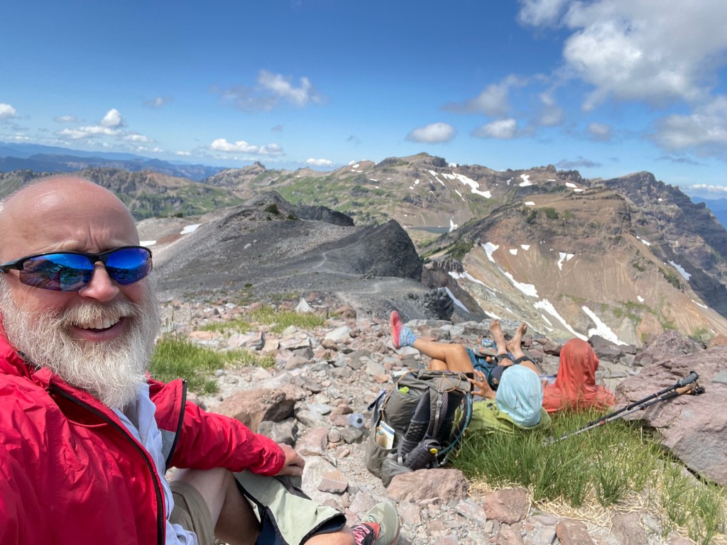 Around 10 am we climbed onto a saddle and that was when the beauty of the Goat Rocks Wilderness really started. We made the short but steep climb up to Cispus Pass and enjoyed a “packs off break” while taking in the views from both sides of the pass.