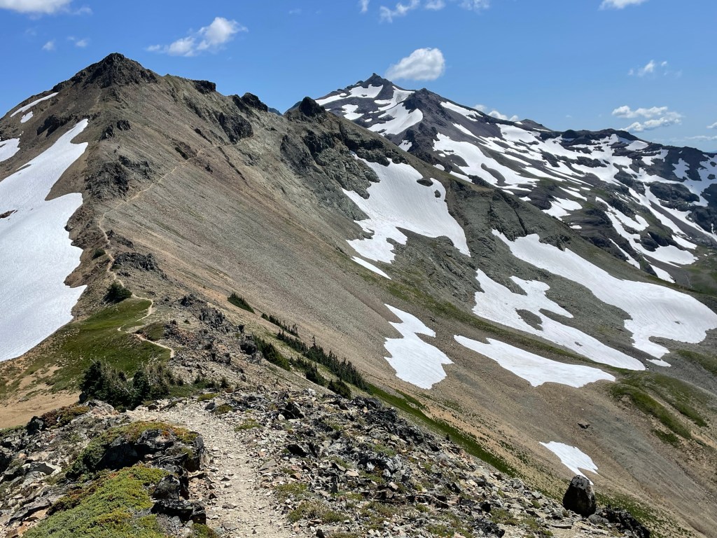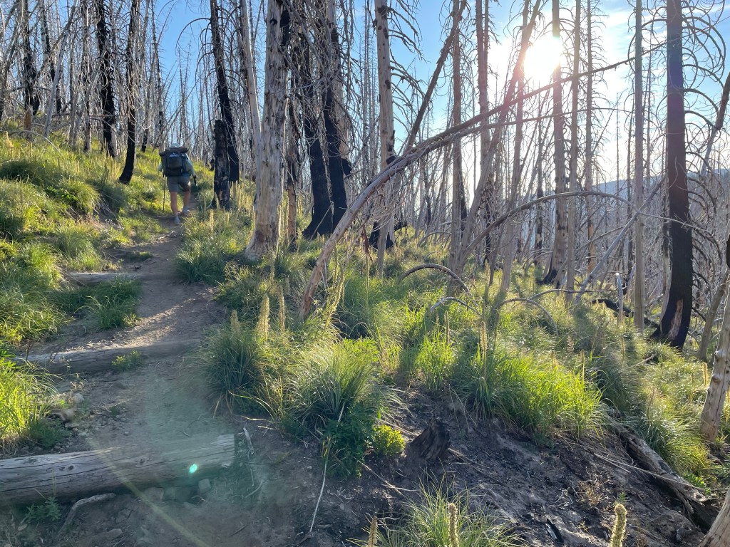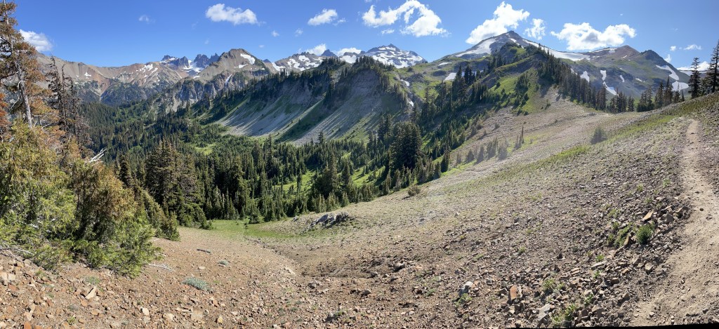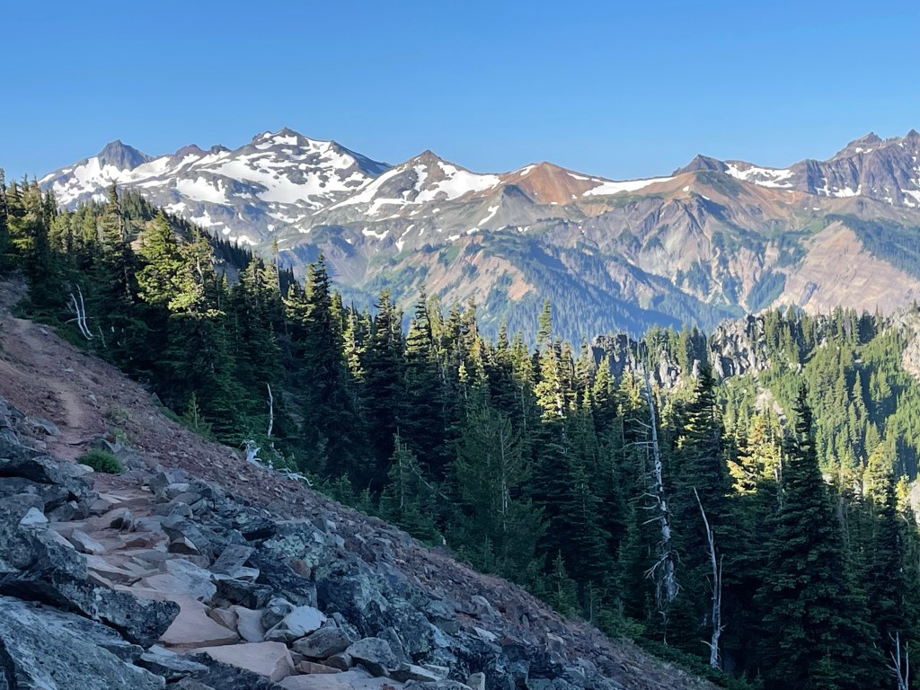 The first half hour of the hike was through the forest. Then as we got higher we walked on a traverse through a burn area and could look back to see the Goat Rocks mountains that we hiked yesterday.