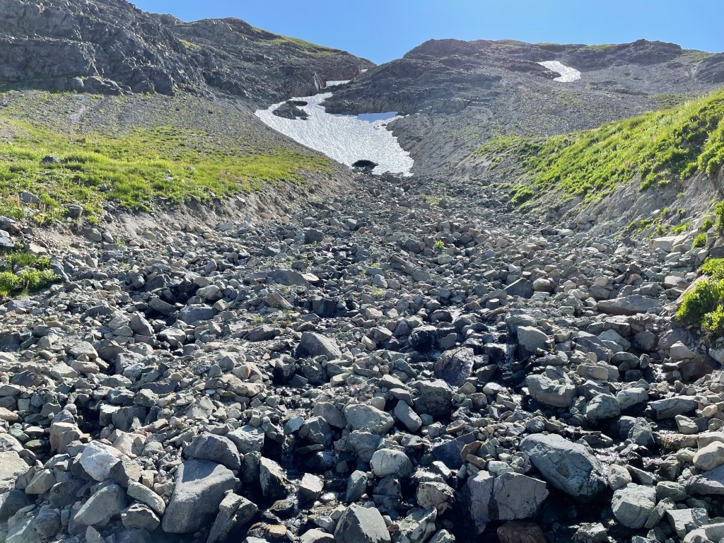 We then went over a saddle and had a closer view of the south side of Mt. Rainier. We sat down in the middle of a boulder field to take in the view. It was beautiful as the early morning sun lit up the mountain.