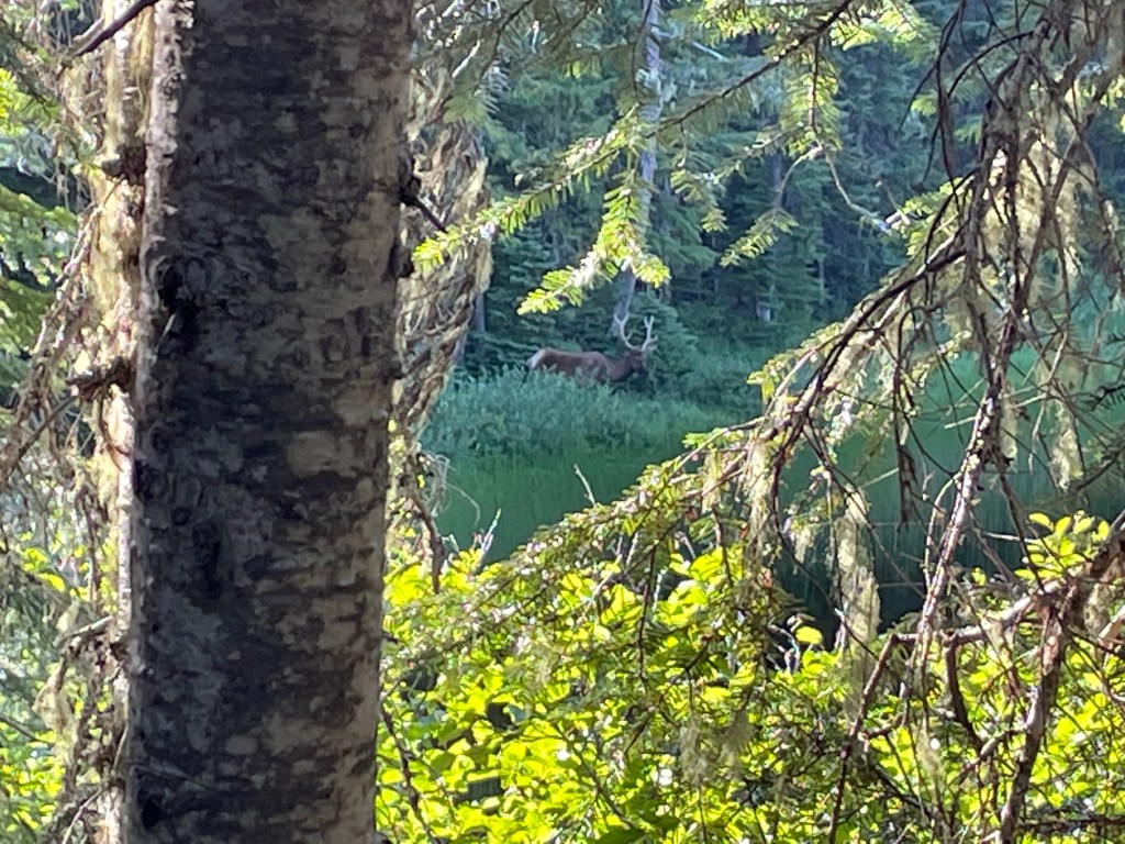 One of the hikers said there was a big elk feeding at the pond we had just passed. Jeff went to check it out and came back with a glowing report. This huge 10-point bill elk was eating at the waters edge. The biggest elk he’s ever seen in the wild.
