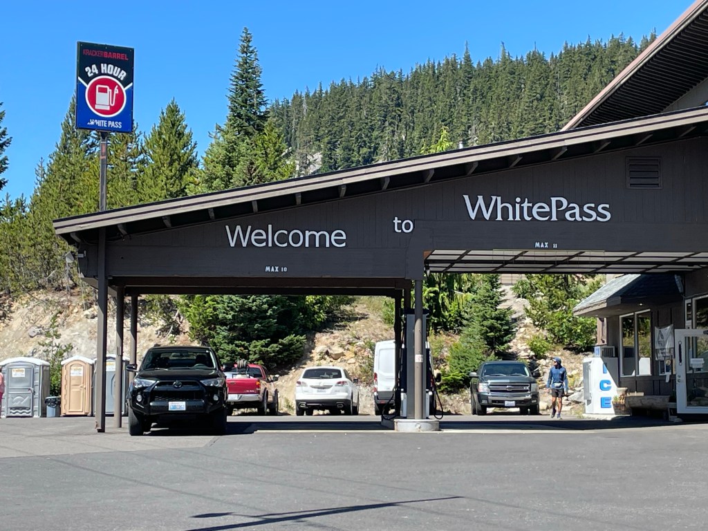 We made it down just before 11 am and saw All In sitting at the trailhead. Apparently, his son was running late and would not get to White Pass until 1:30 pm. We decided to walk the short half mile along the highway from the trailhead to the Kracker Barrel.