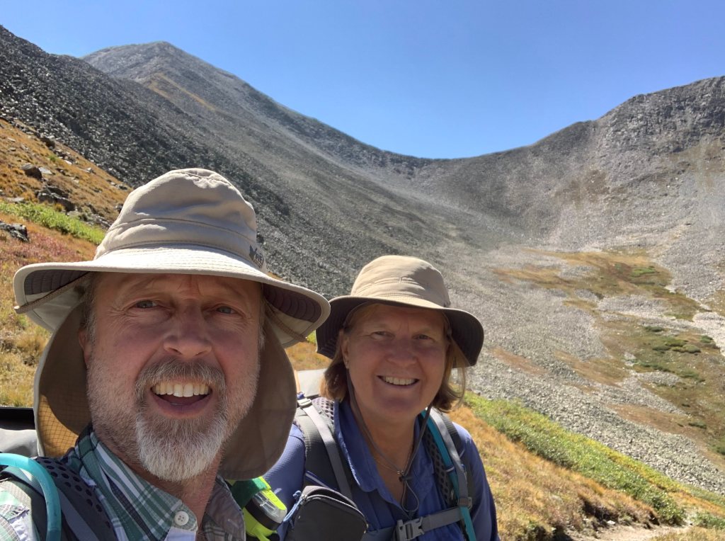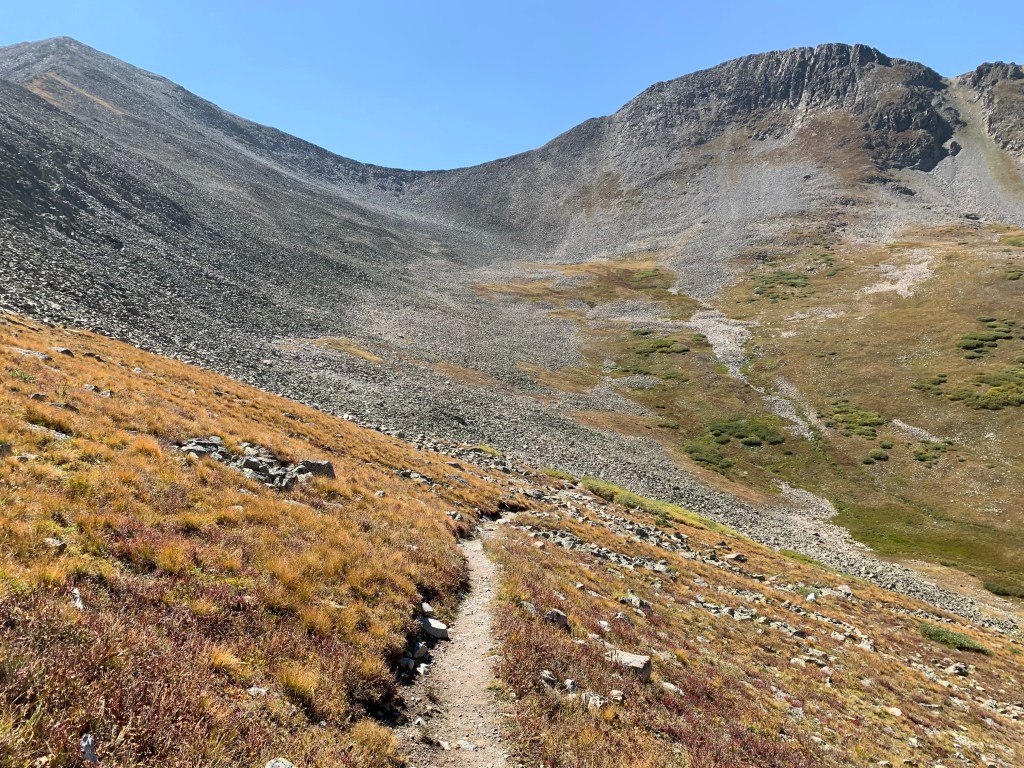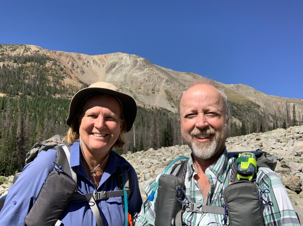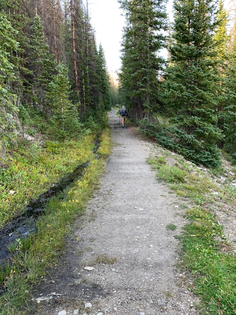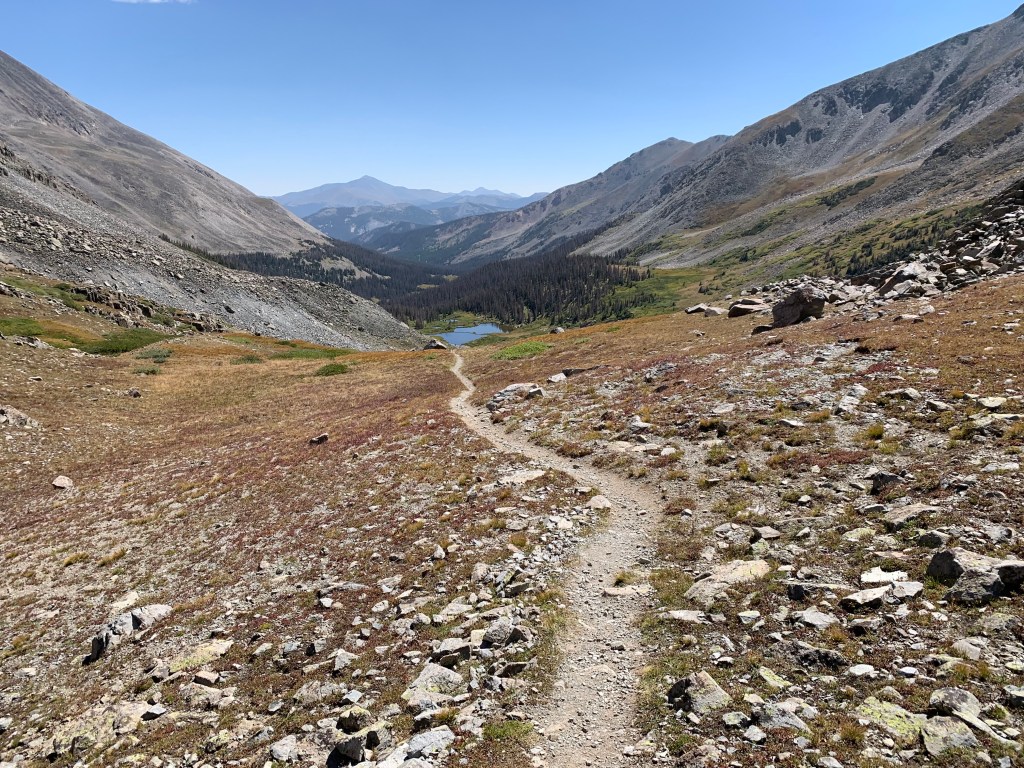 We decided to skip the bottom corner of this loop and jump now to the more spectacular west side. We also needed to cut the miles down a bit so that we could complete the hike with the maximum 6 (+1 spare) days of food that we could comfortably carry. From Hwy 50 we hiked a steep Jeep trail for 1.3 miles before it intersected with the Continental Divide Trail. Once back on the trail it felt great! The trail took us onto a pass at an elevation of 12,146’ and beautiful Hancock lake. This is exactly what we wanted to see! However once atop the pass we could see a Jeep road on the other side and right below the pass.  Seems like cheating to be able to drive that far and high.