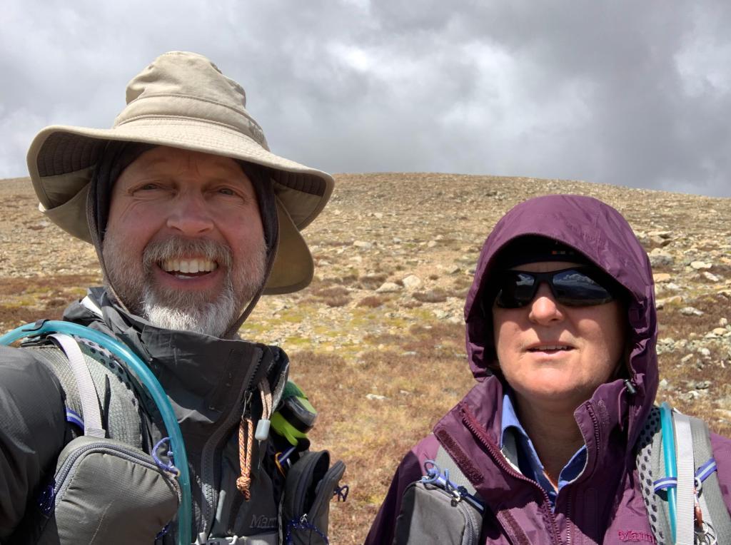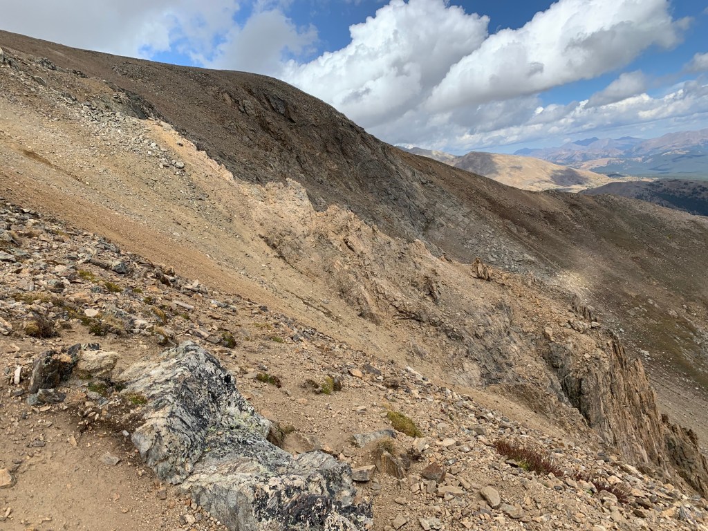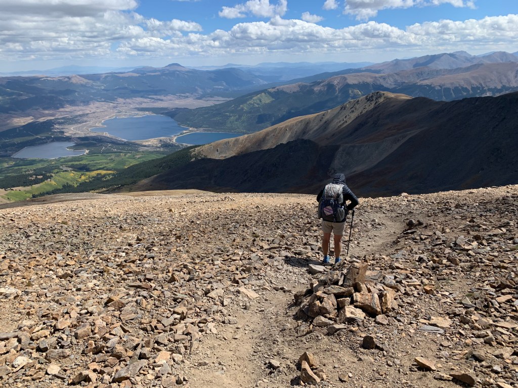 The trail was rocky, steep, and long. The entire route was only 3.5 miles, but they were some of the toughest miles we’d ever done. Finally, at 12:45 pm we summited Mt Elbert. Ellen wrote our names in the summit logbook and we took the obligatory summit picture with the sign. Nice to be on top of our corner of the world! It was surprisingly cold and very windy at the summit and since we found cell service we clumsily texted messages with cold fingers. We had planned on hiking a different (Northeast) route down the mountain but it looked steeper and definitely more exposed to the wind and weather and so we decided to go down the way we came.