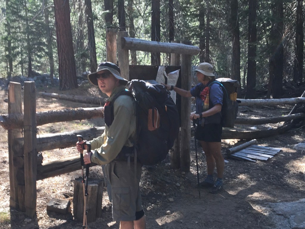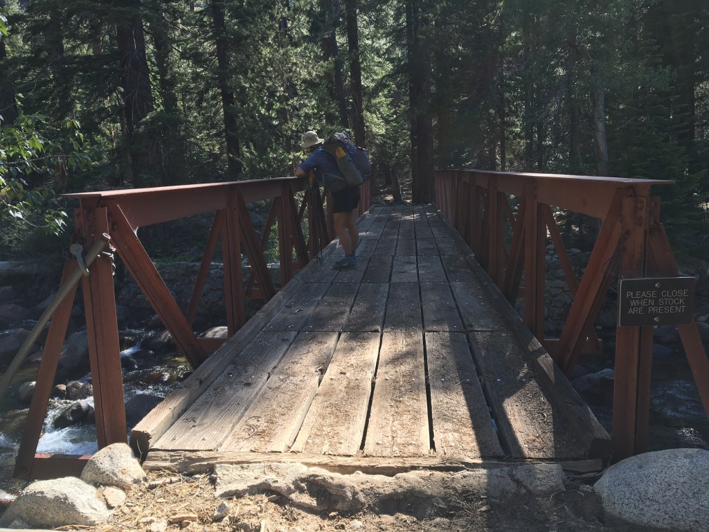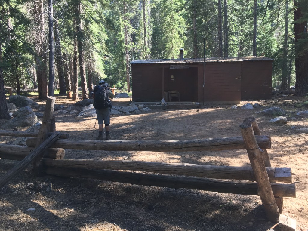 Once down the ridge and through a meadow we crossed a bridge over Roaring River to a USFS ranger hut. Due to Covid-19, all the backcountry ranger stations were unmanned. This location was normally frequented by horse pack groups and so it had an established camp site above the river with a steel bear box, fire pit, and benches. Great site … we were exhausted!